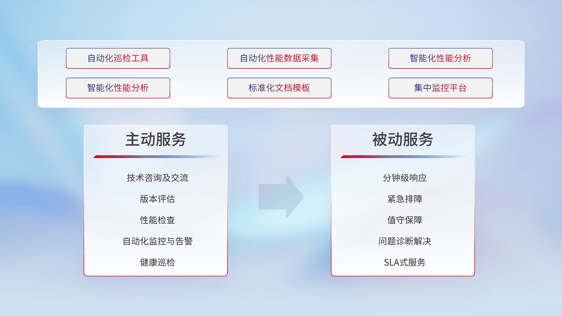 智能化工具和标准化文档,,,保障服务质量,,,提供主动服务(包含技术咨询、、版本评估、、、性能检查、、、、自动化监控与告警、、、、健康巡检)和被动服务包含(分钟级响应、、、、紧急排障、、、值守保障、、、、问题诊断解决、、SLA服务)。。。。